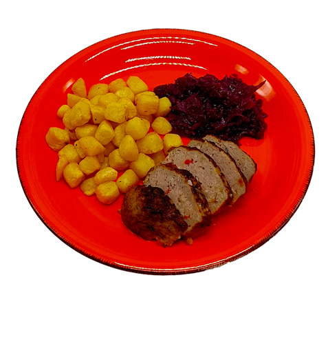 Gehaktbal in jus met wedges en rode kool