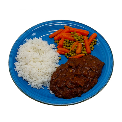 Zuurvlees met rijst en erwten en wortelen